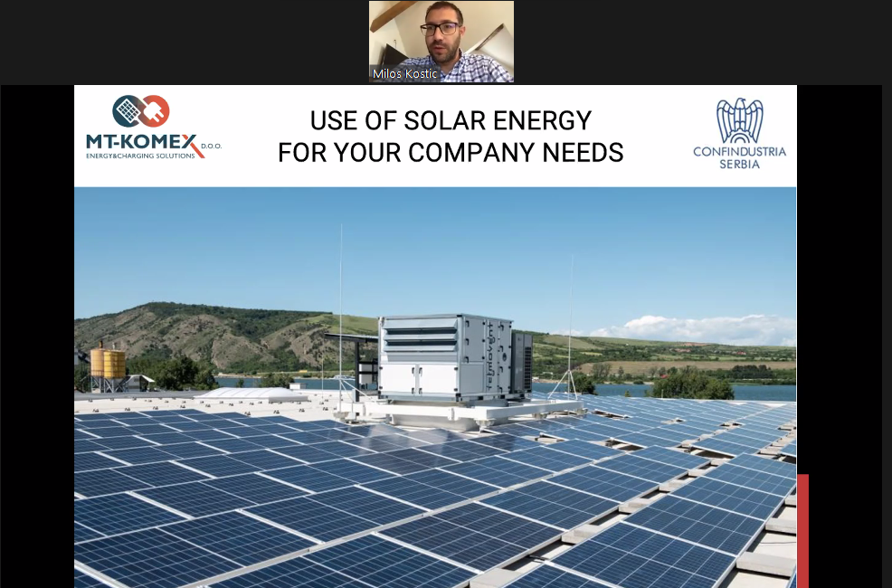 Alla luce della recente adozione della legge sull’uso dell’energia da fonti rinnovabili, Confindustria Serbia, in collaborazione con l’associata MT-Komex ha organizzato ieri 25 maggio, il seminario online dedicato alla presentazione di tutte le opportunità e i vantaggi dell’installazione di pannelli solari presso le aziende e gli stabilimenti produttivi.