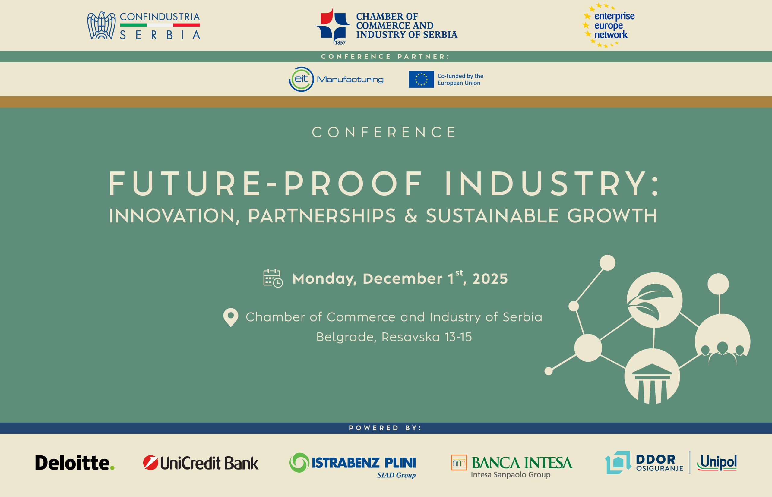 Konferencija se organizuje uz podršku: EIT Manufacturing, Istrabenz Plini, Banca Intesa, Deloitte, UniCredit Bank Serbia, DDOR Osiguranje i Enterprise Europe Network.