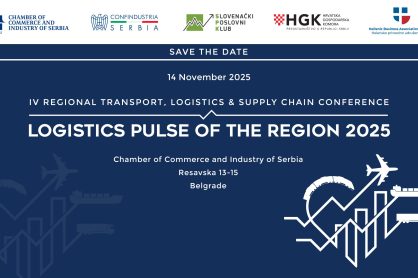 Konfindustrija Srbija, Privredna komora Srbije, Slovenački poslovni klub, Predstavništvo Hrvatske gospodarske komore u Srbiji i Helensko privredno udruženje Srbije pozivaju vas na IV REGIONALNU KONFERENCIJU O TRANSPORTU, LOGISTICI I LANCIMA SNABDEVANJA.