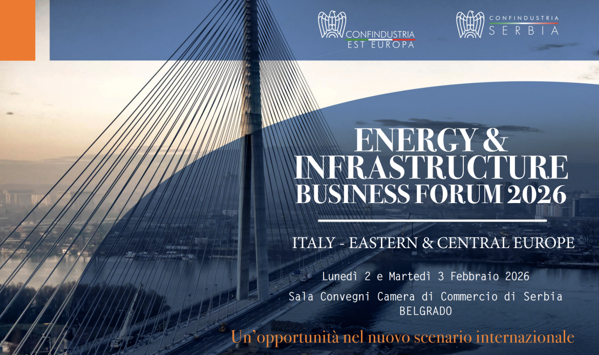 02/11/2025 Događaji,Privredni ambijent,Vesti iz Konfindustrije Italija,Vesti iz Konfindustrije Srbija Prezentacija poslovnog Foruma „Energy & Infrastructure Italy – Eastern & Central Europe“ koji će biti održan 2. i 3. februara 2026. godine u Beogradu