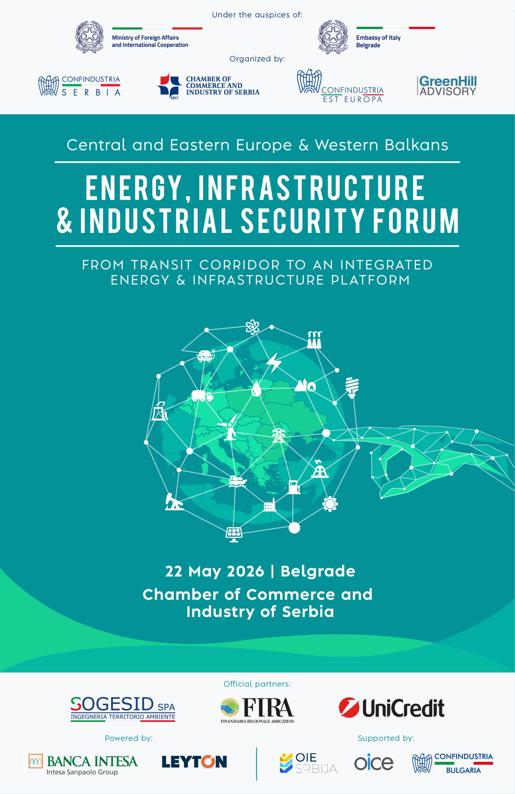 Konfindustrija Srbija, Confindustria Est Europa, Privredna komora Srbije i Greenhill Advisory sa zadovoljstvom vas pozivaju na “CEE – Western Balkans Energy, Infrastructure & Industrial Security Forum” koji će se održati 22. maja 2026. godine u Beogradu, u prostorijama Privredne komore Srbije.
