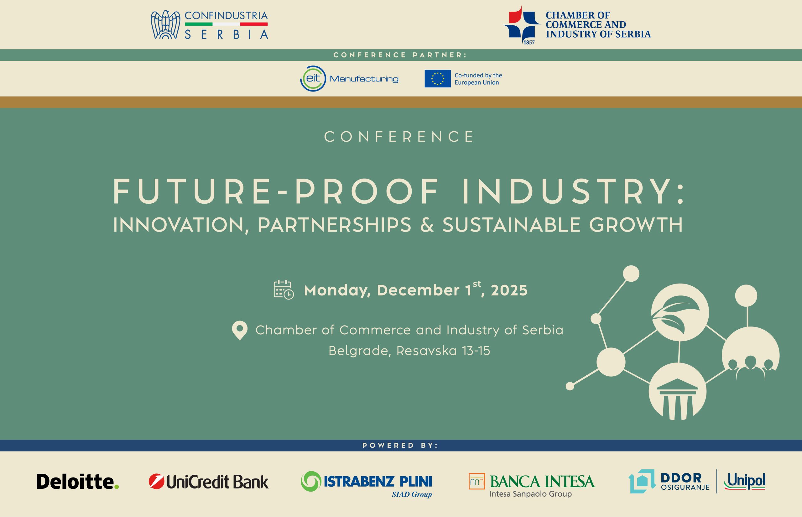 Pozivamo vas na konferenciju FUTURE-PROOF INDUSTRY – Innovation, Partnerships, And Sustainable Growth, gde ćemo zajedno sa poslovnim liderima, donosiocima odluka i inovatorima razgovarati o tome kako inovacije, partnerstva i napredne tehnologije oblikuju održivu i konkurentnu industriju budućnosti.