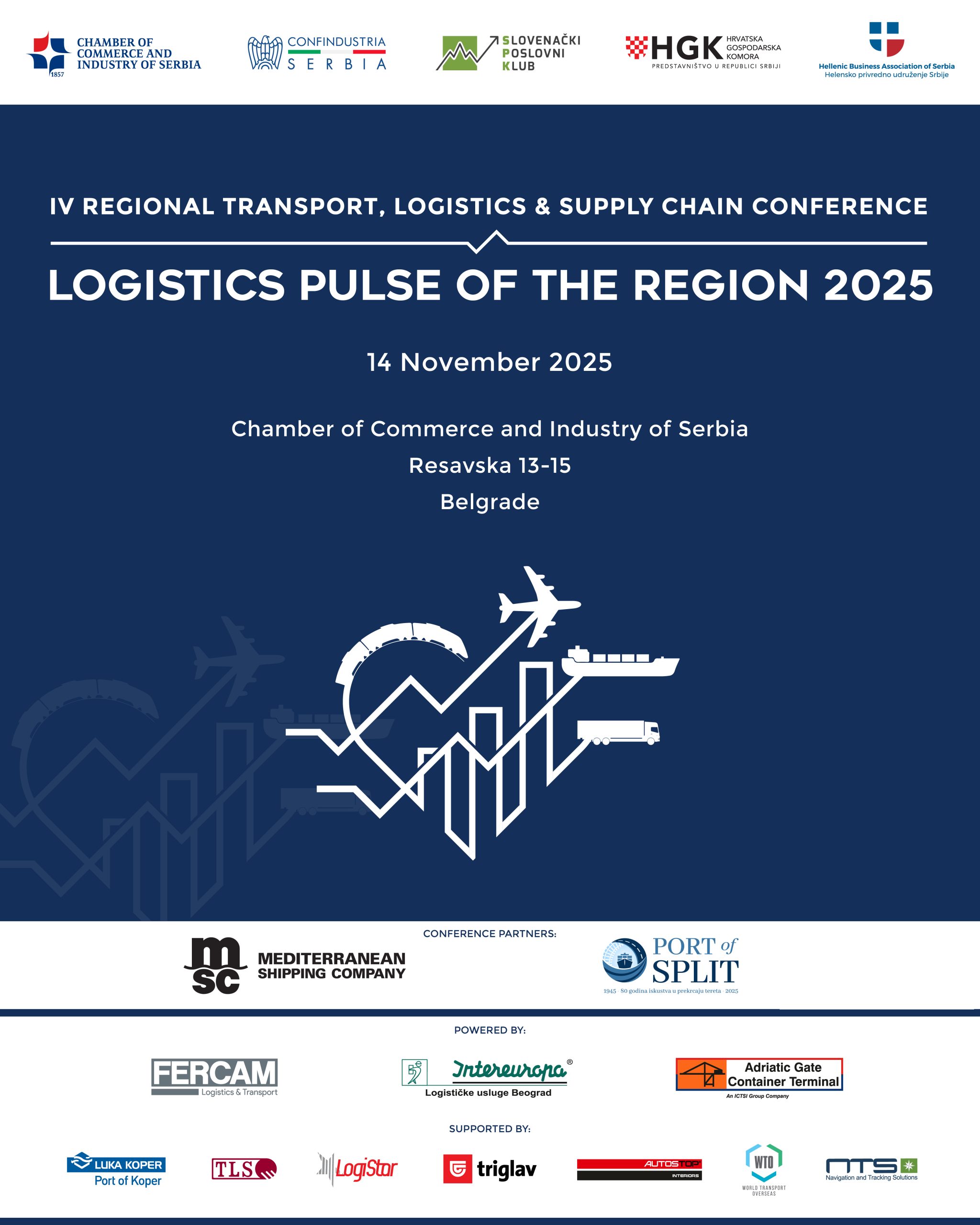 Confindustria Serbia, insieme alla Camera di Commercio e Industria della Serbia, al Business Club Sloveno, all’ufficio di rappresentanza della Camera di Commercio della Croazia in Serbia e all’Associazione Imprenditoriale Ellenica in Serbia, vi invita alla IV CONFERENZA REGIONALE SU TRASPORTI, LOGISTICA E CATENE DI FORNITURA.