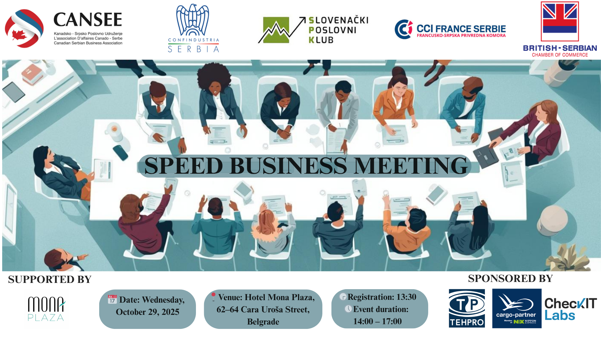 Vi invitiamo al SPEED BUSINESS MEETING – un incontro di business networking che prevede anche la partecipazione dei soci delle seguenti associazioni bilaterali: CANSEE Associazione imprenditoriale canadese-serba, Business Club sloveno SPK, Camera di commercio franco-serba CCIFS e Camera di commercio britannico-serba BSCC.