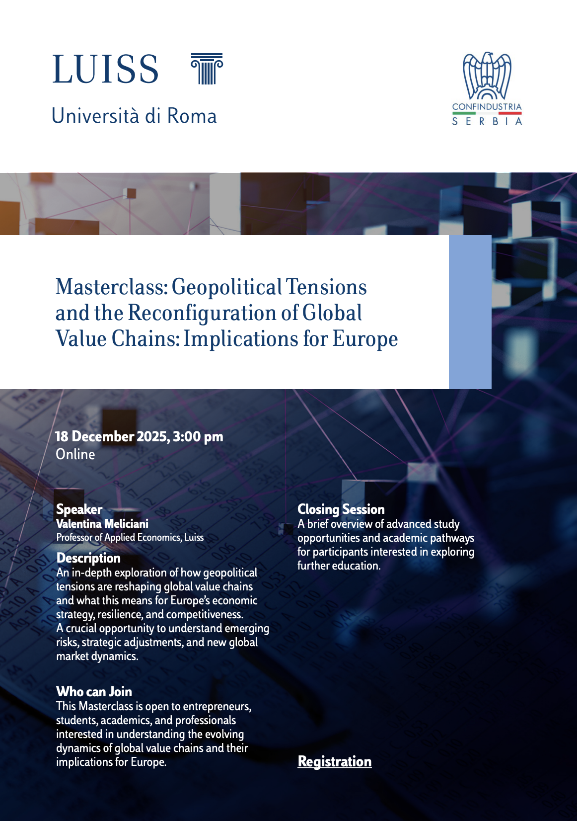 Confindustria Serbia e Università Luiss vi invitano a un approfondimento su come le tensioni geopolitiche stanno trasformando le catene globali del valore e quali sono le implicazioni per la strategia economica europea.